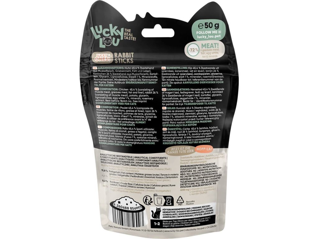 Lucky Ones Sticks jsou chutné masové pamlsky z kuřecího a králičího masa. Ideálně poslouží jako odměna při společných hrách s vaším kočičím mazlíčkem. Rozšiřují řadu Lucky Ones o další skvělé příchutě a zábavný tvar pamlsku. Každá tyčinka je přibližně 7 cm dlouhá a snadno ji lze naporcovat i na menší kousky. bez lepku, obilovin, GMO a přidaného cukru s L-karnitinem, který podporuje spalování tuků voňavé a velice chutné pro kočky všech velikostí i věkových kategorií vyrobeno ve Švýcarsku dostupné ve 4 variantách a mixpacku Pro zachování čerstvosti a vůně jsou baleny v praktickém uzavíratelném balení. Složení: kuře 45,4 % (svalovina, škvarky, tuk a játra), králík 26 % (svalovina), brambory, glycerin, lignocelulóza, protein 1 %, minerální látky, extrakt z rozmarýnu Analýza: hrubé bílkoviny 24,5 %, hrubé oleje a tuky 11,8 %, hrubé popeloviny 4,4 %, hrubá vláknina 5,2 %, vlhkost 20 % Doplňkové nutriční látky na 100 g: L-karnitin (3a910) 6250 mg Hmotnost: 50 g