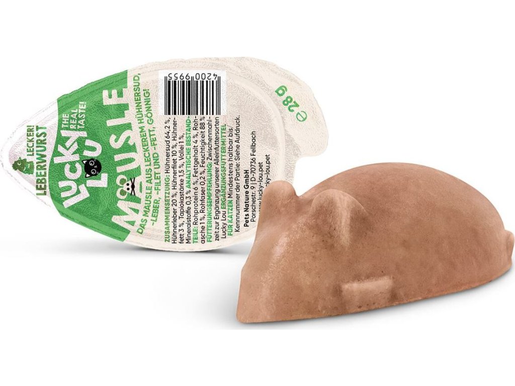 Lucky Lou Mäusle je zdravý pamlsek pro kočky, který rozproudí jejich představivost. Krom nevšedního chuťového zážitku zaujme i svým vzhledem. Můžete jím potěšit vaši kočku kdykoli během dne, a zpestřit tak její jídelníček, nebo jej můžete svému mazlíčkovi darovat ke zvláštní příležitosti. Díky svému důmyslnému designu poslouží i jako dokonalý dárek pro vaše kočičí přátele i jejich majitele. jemná konzistence paštiky obsahuje celé vejce jako extra zdroje vápníku a bílkovin bez obilovin, umělých barviv, konzervantů a přidaného cukru jednoduše se porcuje jeden druh živočišného proteinu i pro citlivá kočičí bříška vhodné pro kočky všech velikostí a všech věkových kategorií skvěle doplňuje vyváženou stravu v kombinaci s mokrým krmivem Lucky Lou vyrobeno v Německu Složení: kuřecí vývar 64,2 %, kuřecí játra 20 %, kuřecí filet 10 %, kuřecí tuk 3 %, tapiokový škrob 1,5 %, celé vejce 1 %, minerální látky 0,3 % Analýza: hrubé bílkoviny 6 %, hrubé oleje a tuky 4 %, hrubé popeloviny 1 %, hrubá vláknina 0,2 %, vlhkost 88 %