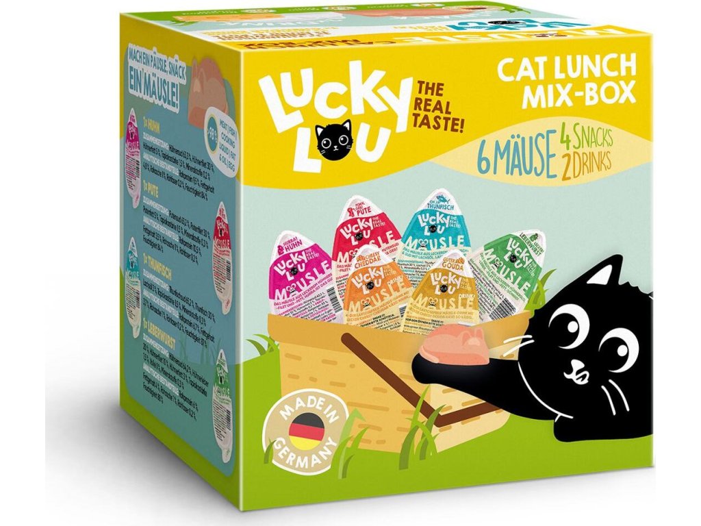 Multipack obsahuje všech 6 druhů oblíbených pamlsků Lucky Lou Mäusle – mokré pochoutky i drinky. Můžete je tak vyzkoušet všechny a zjistit, jaké vaší kočce chutnají nejvíc! Mäusle pamlsky jsou vyrobeny v Německu a zaujmou nejen svou chutí, ale i vzhledem. Balení multipacku pokrývají veselé obrázky kočičího Lucky Lou labužníka a obaly jednotlivých pamlsků mají originální tvar myši. Skvěle se proto hodí i jako stylový dárek pro kočky a jejich majitele. Tento multipack obsahuje: 4 x Lucky Lou Mäusle Šťavnaté pamlsky jemné paštikové konzistence, bez obilovin, umělých barviv, konzervantů a přidaného cukru. Lucky Lou Mäusle tuňák 28 g Lucky Lou Mäusle krůta 28 g Lucky Lou Mäusle kuře 28 g Lucky Lou Mäusle kuřecí játra 28 g 2x Lucky Lou Mäusle Drink Drinky z mléka bez laktózy, obilovin a lepku, s neodolatelnou sýrovou příchutí. Skvělé nejen pro doplnění tekutin. Lucky Lou Mäusle Drink-Snack Gouda 20 ml Lucky Lou Mäusle Drink-Snack Čedar 20 ml Složení pamlsků a jejich dávkování najdete v detailu jednotlivých produktů.