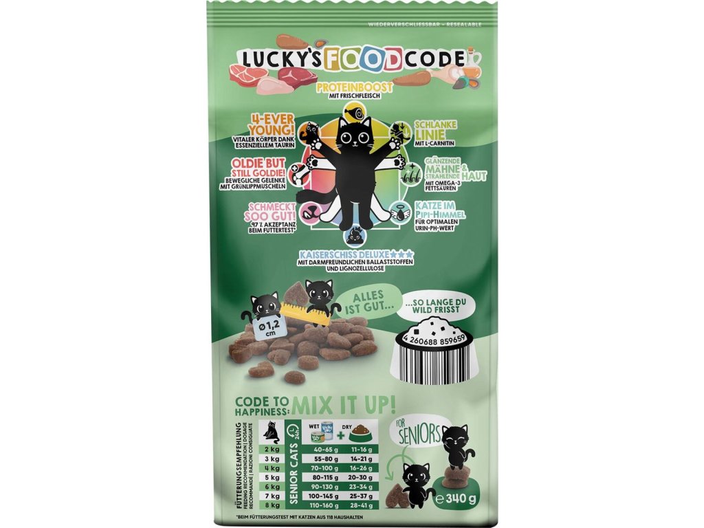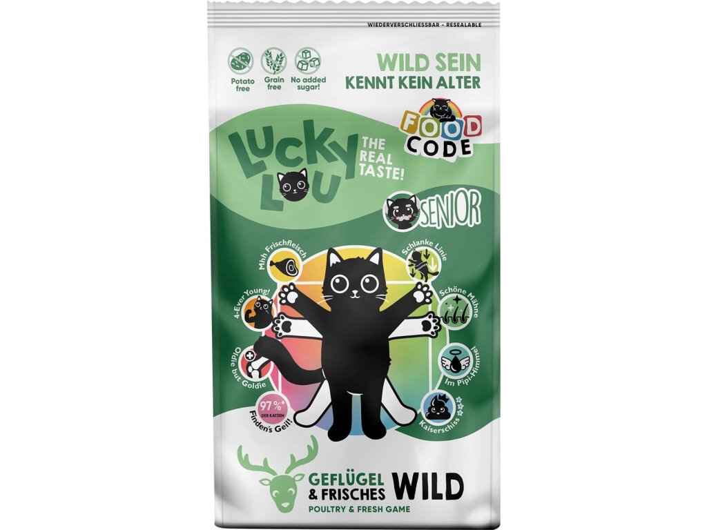 Právě jste objevili to nejzábavnější holistické krmivo pro kočky! Toto krmivo je vytvořen speciálně pro potřeby starších koček, obsahuje kuřecí a drůbeží maso, zvěřinu, tapioku, mrkev, lososový olej, pivovarské kvasnice, slávku a další přírodní suroviny. Je formulováno tak, aby poskytovalo vysoce kvalitní bílkoviny, vitamíny a živiny, které podporují zdraví a vitalitu koček v mnoha směrech – od hlavy až po ocásek! Díky tomuto holistickému konceptu obsahuje každá porce vše, co kočka potřebuje pro dlouhý, spokojený a zdravý život. Tapioka je škrob získávaný z kořene manioku – přirozeně bezlepkové rostliny lehce nasládlé chuti, s nízkým obsahem tuku a vysokou energetickou hodnotou. Díky své snadné stravitelnosti je oblíbenou přílohou nejen v hypoalergenních krmivech. Lněné semínko je bohatým zdrojem omega-3 mastných kyselin, které podporují zdravou srst, kůži i srdce. Díky vysokému obsahu vlákniny přispívá k optimálnímu trávení a obsažené antioxidanty podporují silnou imunitu. Do kočičí misky nepatří obiloviny, přidaný cukr ani konzervační látky, a proto je nenajdete ani v krmivu Lucky Lou. Při výrobě se rovněž nepoužívají žádné GMO suroviny a netestuje se na zvířatech. bez lepku, obilovin, přidaného cukru a konzervačních látek holistický koncept – podporuje celkové zdraví kočky obsahuje pouze přírodní suroviny s taurinem – esenciální aminokyselinou, nezbytnou nejen pro zdravý zrak a srdce velikost a tvar granulí jsou uzpůsobené pro snadné žvýkání – některé mají tvar srdíček! maximální chutnost – až 97 % koček si krmivo Lucky Lou zamilovalo! lze podávat samostatně nebo v kombinaci s mokrým krmivem Lucky Lou Lucky Lou se stará o každý detail, a proto i jednotlivé granule jsou tvarem a velikostí (1,2 cm v průměru) uzpůsobeny pro snadné žvýkání bez hltání a některé z nich mají roztomilý tvar srdíčka, který si zamiluje nejen vaše kočka, ale i vy! Složení: drůbeží maso 50 % (sušené drůbeží maso 27 %, čerstvé kuřecí maso 10 %, drůbeží bílkoviny, drůbeží tuk), tapioka 23 %, čerstvá zvěřina 10 %, hrách, lignocelulóza 3 %, mrkev, lososový olej 1 %, lněné semínko (čerstvě drcené) 0,5 %, pivovarské kvasnice 0,5 %, čekanka 0,1 %, slávka zelenoústá 0,1 % Analýza: hrubé bílkoviny 33 %, hrubé oleje a tuky 15 %, hrubé popeloviny 7 %, hrubá vláknina 5 %, vápník 1 %, fosfor 0,8 %, omega-3 mastné kyseliny 0,4 %, omega-6 mastné kyseliny 2 % Energetická hodnota: 365 kcal/100 g Nutriční doplňkové látky na 1 kg: zinek (3b603) 100 mg, mangan (3b502) 10 mg, měď (3b405) 8 mg, jód (3b202) 2,6 mg, vitamin A (3a672a) 18000 I.U./IU/UI, vitamin D3 (3a671) 1300 I.U./IU/UI, taurin (3a370) 1500 mg Doporučené dávkování: Receptury pro každou fázi kočičího života: Lucky Lou receptury kombinují vše, co kočky potřebují a chtějí v jedné misce. Jsou vytvořeny tak, aby naplňovaly přirozené potřeby koček v jednotlivých fázích jejich života – protože koťata, dospělé kočky i senioři potřebují nejen jiné složení, ale i jiné množství vitamínů a živin, jinou energetickou hodnotu či velikost granulí. Krmivo Lucky Lou Food Code je inspirováno konceptem Vitruviánského muže od Leonarda da Vinciho a jedinečným způsobem tak kombinuje 8 výhod pro holistický koncept zdraví. Odráží tím da Vinciho pohled na dokonalé proporce těla, jeho krásu, zdraví a dokonalost do kočičího světa. Díky použití nejnovějších technologií, pravidelným kontrolám kvality a nejvyšší jakosti použitých surovin jsou krmiva Lucky Lou lehce stravitelné a staly se absolutním hitem i u vybíravých koček. Plných 97 % všech testovaných strávníků si toto krmivo zamilovalo! S Lucky Lou si můžete být jisti, že vaše kočka dostává to nejlepší, co jí příroda a věda mohou nabídnout, a že její miska je plná chutí, které si zamiluje!