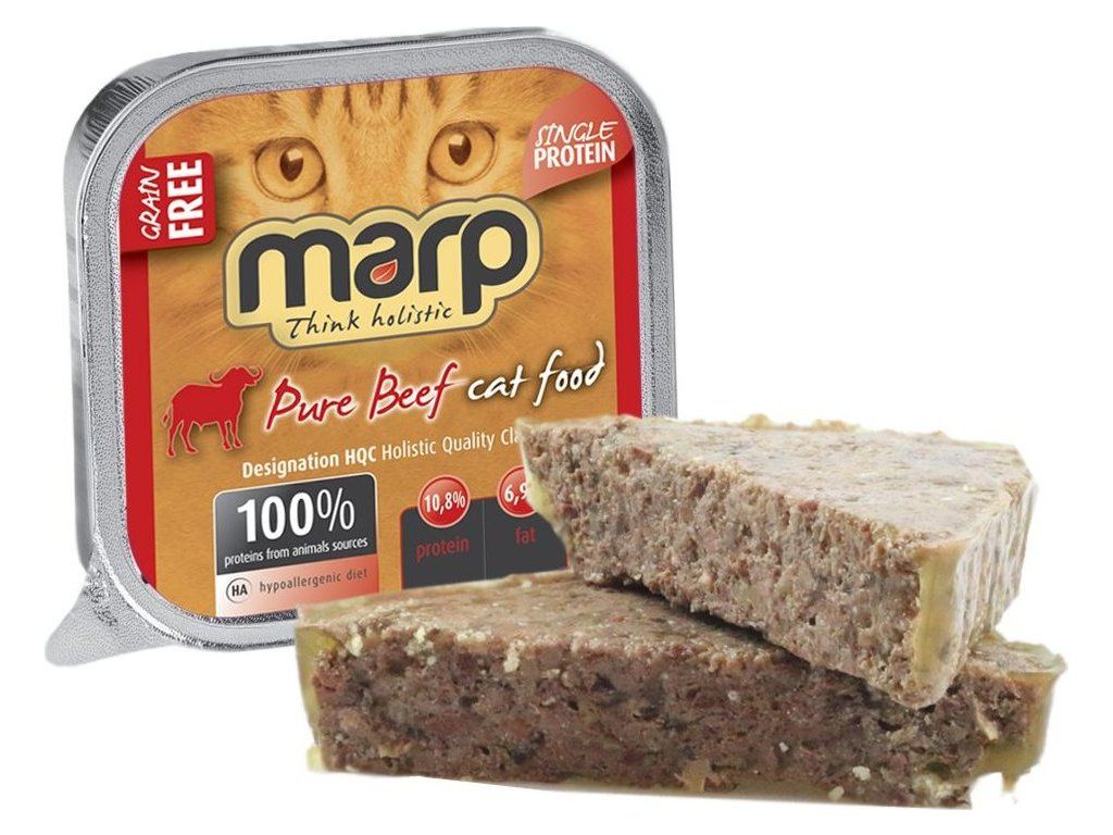 Víme, že kočka je masožravec a proto ji jako takovou ctíme. Vaničky Marp Pure obsahují 100% bílkovin ze živočišných zdrojů. Obsahují pouze maso, vnitřnosti, vývar a minerály. Nepoužíváme žádné umělé konzervanty, barviva, plnidla apod. a jsou vždy bez jakýchkoliv obilovin. Vanička Marp s hovězím bez obilovin je vhodná i pro kočky s citlivým zažíváním a dle našich zkušeností je velmi vhodná i pro kočky s potravními alergiemi.