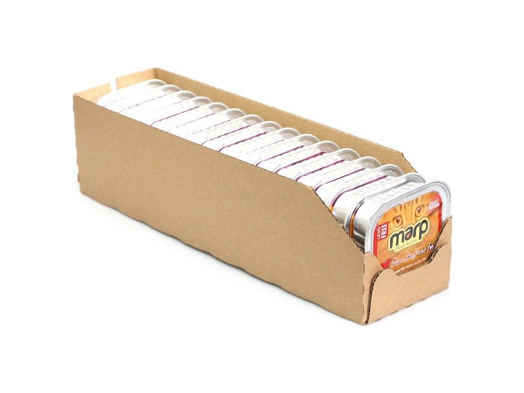 Víme, že kočka je masožravec a proto ji jako takovou ctíme. Vaničky Marp Pure obsahují 100% bílkovin ze živočišných zdrojů. Obsahují pouze maso, vnitřnosti, vývar a minerály. Nepoužíváme žádné umělé konzervanty, barviva, plnidla apod. a jsou vždy bez jakýchkoliv obilovin. Vanička Marp s hovězím bez obilovin je vhodná i pro kočky s citlivým zažíváním a dle našich zkušeností je velmi vhodná i pro kočky s potravními alergiemi.