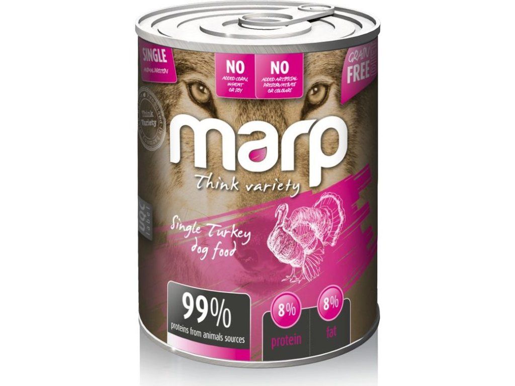 Konzervy Marp Variety Single obsahují 99% bílkovin ze živočišných zdrojů - tato konzerva obsahuje pouze krůtu. Díky tomuto unikátnímu druhu masa jsou vhodné i pro citlivé psy a psy s potravními alergiemi. Konzervy můžete použít samotné, ale velmi dobře se hodí pro přimíchávání do granulí. Nepoužíváme žádné umělé konzervanty, barviva, plnidla apod.