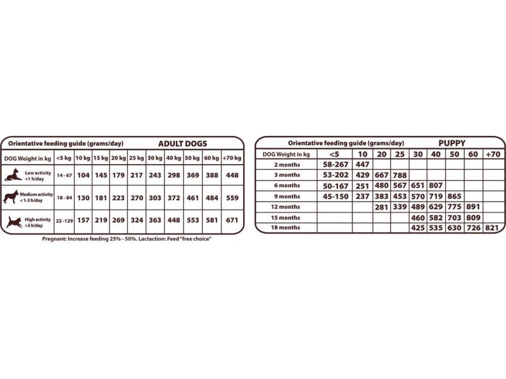 Analytické složení: Hrubý protein (33 %), hrubé oleje a tuky (19 %), hrubá vláknina (2,5 %), hrubý popel (7 %), vápník (1,3 %), fosfor (1 %), omega 3 mastné kyseliny (0,5 %), omega 6 mastné kyseliny (3,5 %), EPA+DHA (0,5 %).