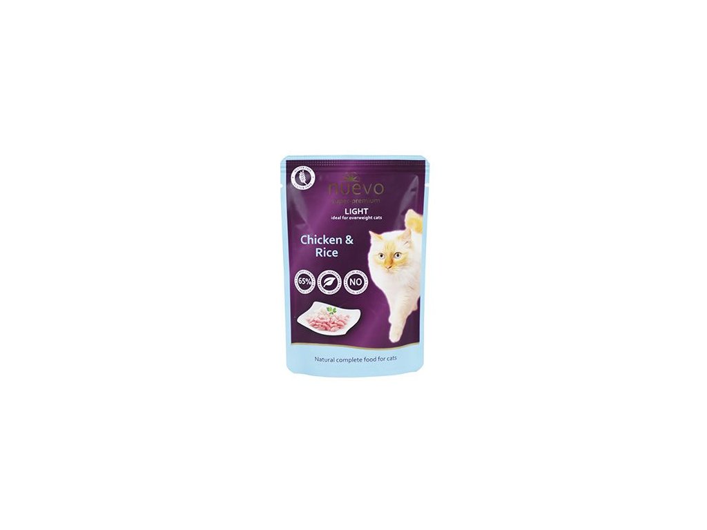 Kočičí kapsa Nuevo light kuřecí s rýží je kompletní krmivo pro dospělé kočky s nadváhou s kuřecím masem a rýží. Díky vysokému obsahu masa a přírodních surovin a žádnému obsahu umělých přísad, obilí a lepku patří toto krmivo do vysoce kvaliního a i ta nejvybíravější kočička si jej určitě zamiluje!