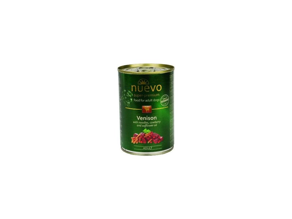 Konzerva Nuevo pes adult Zvěřinové menu je speciální krmivem pro dospělé psy. Zvěřina zajišťuje veškeré potřebné výživné látky pro vašeho psa. Vysoký obsah masa společně s nudlemi a vynikajícím světlicovým olejem jsou tím nejlepším z této receptury. Světlicový olej podporuje zdravý kožich díky dokonalé kombinaci esenciálních mastných kyselin a podněcuje dobré trávení.