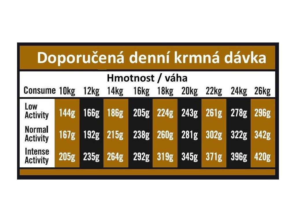 Analytické složky: Hrubý protein 26 %, hrubý olej a tuky 16 %, EPA+DHA 500 mg / kg, hrubá vláknina 2,75 %, hrubý popel 8 %, vápník 1,35 %, fosfor 0,95 %.