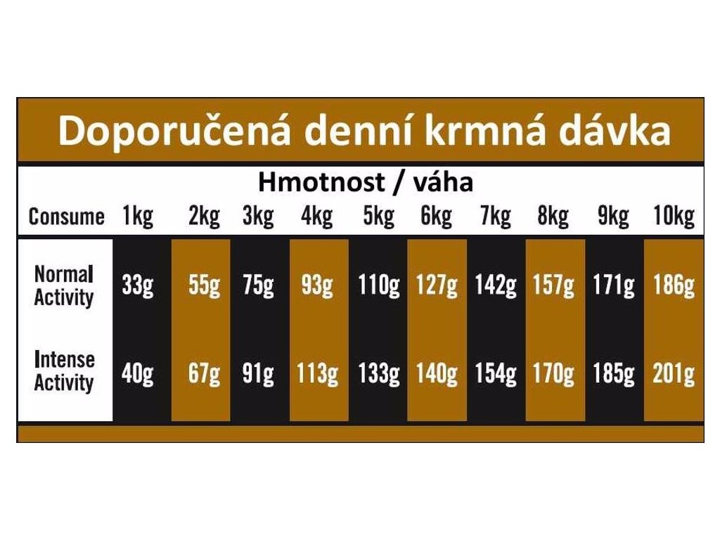 Analytické složky: Hrubý protein 27 %, hrubý olej a tuky 17 %, EPA+DHA 445 mg / kg, hrubá vláknina 2,5 %, hrubý popel 8 %, vápník 1,2 %, fosfor 1,00 %.