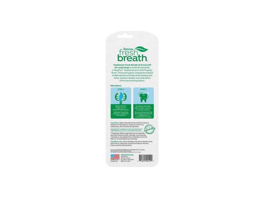 Sada na čištění zubů pro psy obsahuje: Cleen Teeth Gel – gel na čištění zubů, pomáhá snižovat a omezovat tvorbu plaku a zubního kamene. Gel ničí bakterie, které způsobují špatný dech, tvorbu zubního kamene a zánět dásní. Kartáček na prst QuickFinger - s gumovými štětinkami na čištění zubů a masírování dásní. Kartáček Tripleflex – zubní kartáček s trojitou hlavou zuby nejúčinněji vyčistí z všech stran. Určeno pro středně velké a velké psy. Objem: 59 ml Složení: voda, přirozeně odvozený alkohol, glycerin, carbomer, máta, přírodní čisticí prostředek, chlorid zinečnatý (0,01 g /10 ml), extrakt z listů zeleného čaje Způsob použití: naneste malé množství gelu na kartáček, který Vám a Vašemu psovi více vyhovuje a krouživými pohyby zuby jemně vyčistěte. Nikdy nepoužívejte pastu určenou pro lidi, která by mohla podráždit zvířeti žaludek. Zuby čistěte 1x denně večer. Po aplikaci se zvíře začne olizovat, což je zcela normální a pomáhá to promísit gel se slinami a dostat gel všude, kde je to potřeba. Pro maximální efekt by zvíře nemělo 30 minut před a 30 min po aplikaci jíst ani pít. V případě správného použití začíná gel působit okamžitě. Zpravidla po 30 dnech je možné přejít na aplikaci 2x týdně k zajištění prevence tvorby plaku a zubního kamene. Skladujte v suchu při teplotě do 37 °C. Minimální doba použitelnosti je 24 měsíců od data výroby vyznačeného na obalu. Datum je ve formátu DDD/YY a značí kolikátý den v daném roce byl přípravek vyroben. Upozornění: Uchovávejte mimo dosah dětí. Vyvinuto pro psy a kočky. V případě zasažení očí je důkladně vypláchněte velkým množstvím vody. V případě požití vypijte 2 sklenice vody. Rozhodnutí o schválení pro veterinární přípravek má číslo 146-10/C.