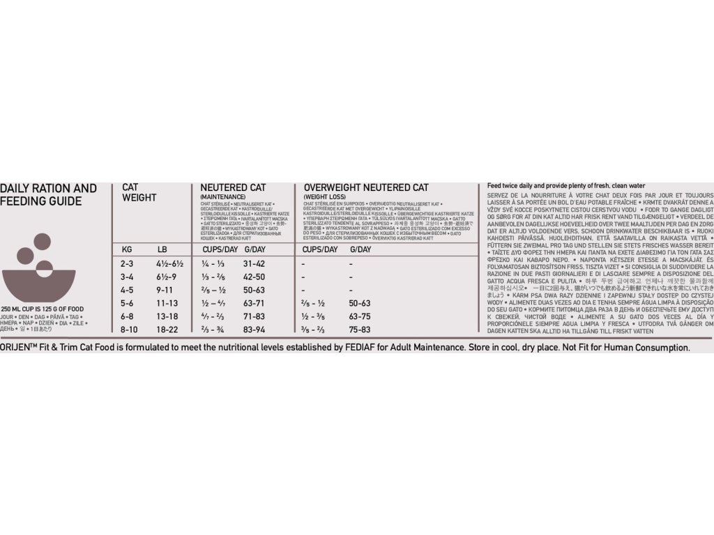 ORIJEN FIT & TRIM se vyznačuje bezkonkurenčním obsahem volně chovaných kuřat a krůt, ryb lovených v přírodních vodách a vajec z hnízdních chovů, vše je dodávané čerstvé nebo syrové v bohatě výživném podílu Celé kořisti. S nízkým obsahem tuků a sacharidů a s jedinečnou chutí jablek, dýní a máslových dýní zaručí krmivo ORIJEN vrcholovou kondici všech dospělých koček, včetně té vaší.