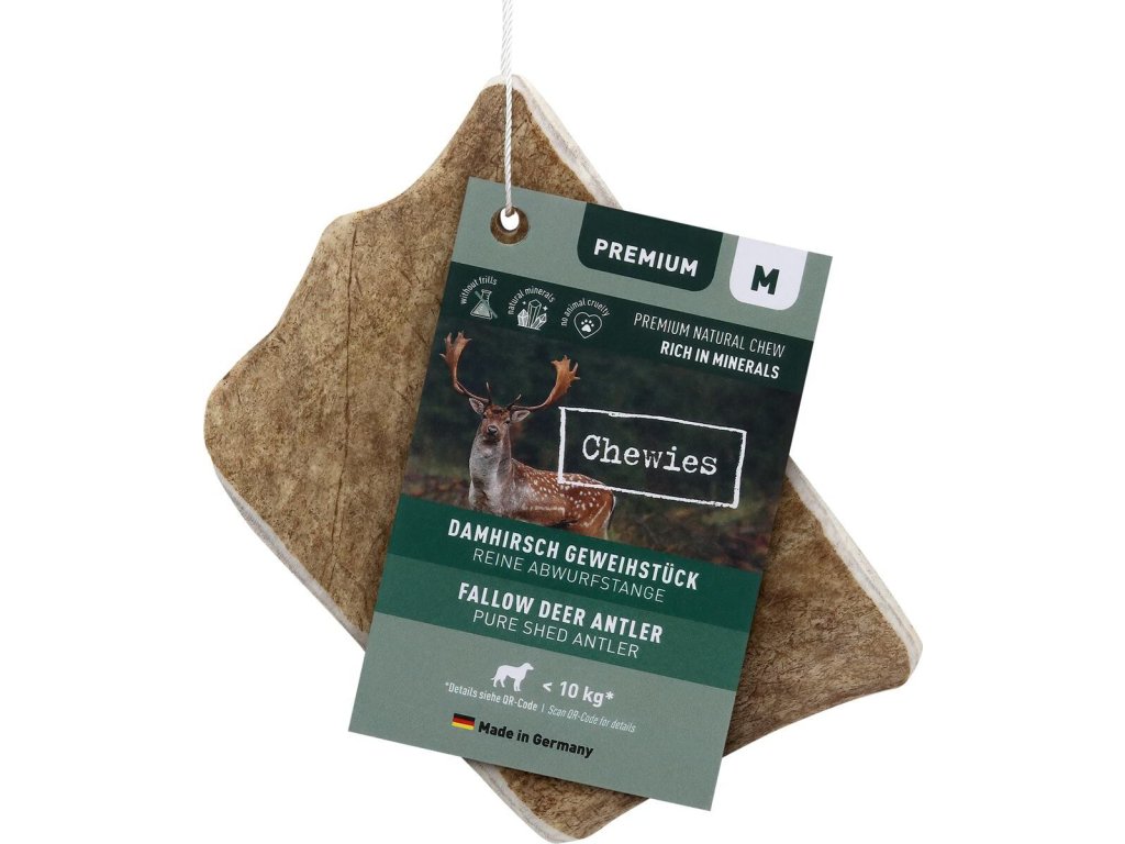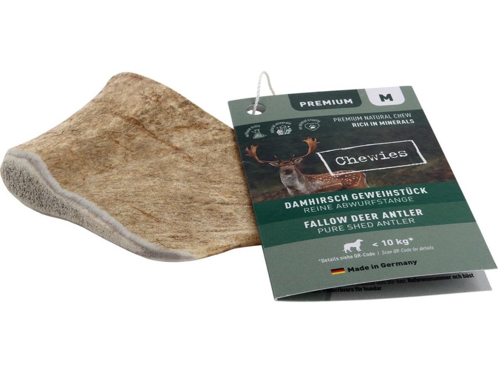 Stoprocentně čisté shozené dančí paroží vhodné jako žvýkací pamlsek k čištění zubů psa, k uspokojení potřeby žvýkání a pudu hravosti psa. Nejpřirozenější žvýkací pamlsek na světě. Dančí paroží je o trochu měkčí a tenčí než paroží jelení a je tak vhodné pro mladé psy, psí seniory a psy, kteří mají menší sílu v zubech. Paroží také obsahuje mnoho cenných minerálů a výživných látek. Psi mají od přírody výraznou potřebu žvýkání, kterou paroží s minerály dokonale uspokojí přirozeným způsobem, bez ohledu na věk a plemeno. Paroží je zároveň výborná a odolná hračka, která psa zabaví na dlouhou dobu. Žvýkaní je navíc pro psa důležitou relaxací. Výskyt a vlastnosti paroží Chewies paroží s minerály jsou stoprocentně vyráběny ze shozů paroží vysoké zvěře. Daněk ztrácí paroží jednou ročně zcela přirozeným způsobem. Shozy se sbírají a ručně zpracovávají v různých velikostech. Shozené paroží se svými vlastnostmi ideálně hodí jako žvýkací hračka pro psy. Struktura je tvrdá a maximálně odolná. Je vyloučeno, aby pes paroží rozbil nebo rozkousal. Nemůže se tedy zranit, jak se například stává v případě ostrých úlomků klacků či větví. Shozené paroží je asi nejstarším pamlskem pro posílení žvýkacích svalů a čištění zubů, který vlci upřednostňují již po tisíciletí. Různé funkce Chewies paroží s minerály Potřeba žvýkat Psi jakéhokoli věku a jakéhokoli plemene od přírody velmi rádi žvýkají. Zvýšenou touhu po žvýkání lze navíc ve zvláštní míře pozorovat při výměně psího chrupu. Této základní potřebě vycházejí Chewies paroží s minerály vstříc dokonalým způsobem. Paroží, která jsou robustní a nelámou se, odolají sebesilnější čelisti. Pes s potřebou žvýkat se tak může dosyta vyřádit. V důsledku toho, že jsou domestikovaní psi většinou krmeni hotovou průmyslovou stravou, má uspokojování přirozené žvýkací potřeby zvláštní význam. Zatímco vlk ve volné přírodě může žvýkat kosti své kořisti, hledá domácí pes něco srovnatelného ve své misce marně. Vraťte svému psovi kus přírody v podobě Chewies paroží s minerály. Péče o zuby To, co je kost ve volné přírodě, jsou Chewies paroží s minerály ve vašem obýváku – přirozená péče o zuby psa. Žvýkáním pes obrušuje nejen paroží, ale současně i zubní kámen ze svého chrupu. Výsledkem jsou zdravé a pevné zuby v odolné a pevné dásni! Paroží je 100 % přírodní a navíc obsahuje mnoho výživných a minerálních látek. Relaxace a zdolávání stresu Vydatné žvýkání, hryzání a kousání Chewies paroží s minerály je ryzí relaxací pro psí duši. Při žvýkání se vašemu čtyřnohému příteli uvolňují endorfiny, které způsobují pocit štěstí. Po dlouhém a nerušeném zaměstnání žvýkacím pamlskem je proto pes klidný a vyrovnaný. Zvíře se po dni plném zážitků rádo uchýlí do ústraní se „svým úlovkem“ z paroží a zpracovává svým způsobem to, co zažilo. Hra a zábava Chewies paroží s minerály slouží dále jako dobrá a odolná hračka. Tyčky z paroží slouží například na zahradě jako užitečná hračka, kterou psovi házíte a on ji obětavě a nadšeně aportuje. Když se pes nudí, poslouží žvýkací tyčky jako občasné příjemné zaměstnání. Žvýkací tyčku posouvá tlapkami po zemi nebo ji tlamou vysokým obloukem vyhazuje do vzduchu. Ať už Chewies paroží s minerály nakonec použijete jakkoli, máte kromě nadšení svého psa ještě jistotu, že jako odpovědný chovatel používáte ekologicky nezávadný výrobek. Tyčky ze shozeného paroží se k vám dostávají přesně tak, jak vyrostly jelenovi – bez změkčovadel, barviv nebo chuťových látek. Chewies paroží s minerály nejsou chemicky ošetřeny. Velikost Medium je vhodná pro psy do 25 kg. V balení je jeden kus o hmostnosti 80 - 120 g. Složení: 100% dančí paroží Analýza: hrubý popel 53%, hrubý protein 35% vlhkost 8%, hrubá vláknina 3%, tuk 0,1%. Obsah minerálních látek: vápník 23%, fosfor 7%, sodík 1,3%, hořčík 5140 mg/kg, železo 192 mg/kg Shozené paroží vysoké zvěře je omezenou surovinou. Ručně vybrané a přiřezávané kusy paroží nejsou laciné, avšak cena odpovídá jejich hodnotě. Váš pes se bude z Chewies paroží radovat 4 - 6 týdnů.