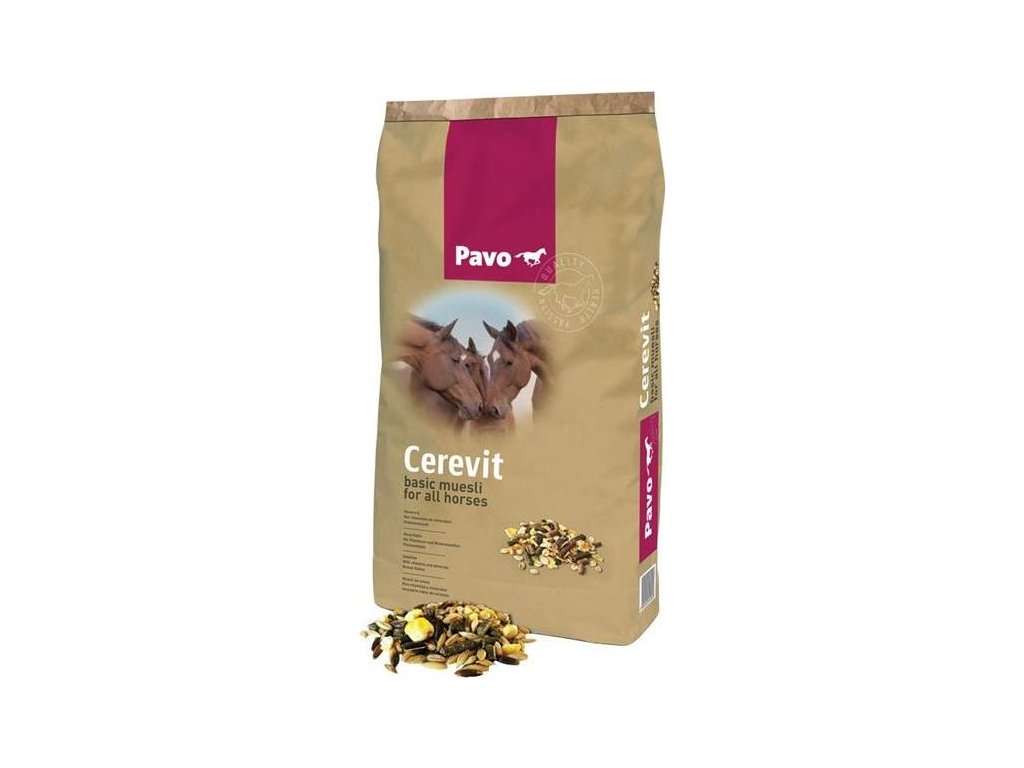 Pavo Cerevit je vysoce stravitelné müsli s vločkovanými a celými zrny. S tímto krmením můžete vašemu koni dát všechny potřebné vitamíny a minerály pro dobré zdraví. Toto müsli je velmi pečlivě zkombinováno, neobsahuje oves a má nízký obsah proteinů. Pavo Cerevit je základní müsli pro všechny koně a poníky.