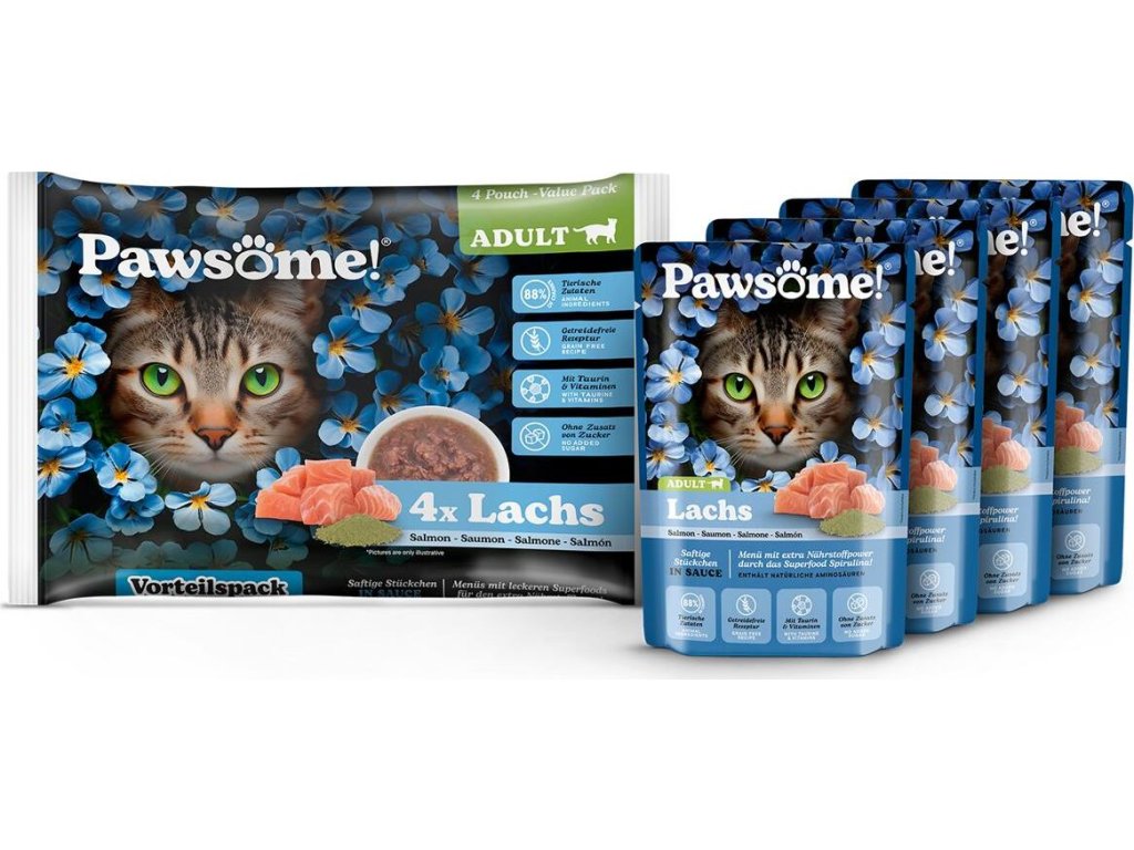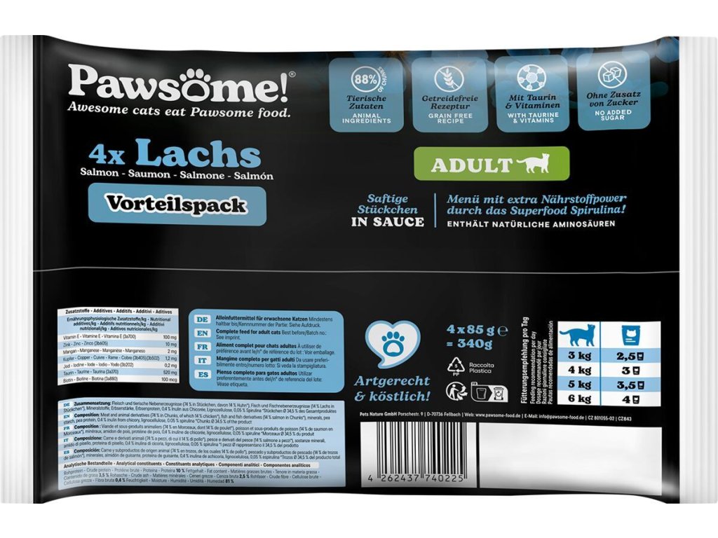 Šťavnaté kousky z lososa a kuřecího masa se spirulinou v lahodné omáčce jsou kompletním krmivem s vyváženým podílem bílkovin, tuků, vitamínů a minerálů, které přispívají ke spokojenému a aktivnímu životu dospělých koček všech plemen a velikostí. Krmivo Pawsome! je vytvořeno tak, aby splňovalo očekávání i těch nejmlsnějších mazlíčků a zároveň zajišťovalo jejich zdraví, vitalitu a celkovou spokojenost. Jeho delikátní chuť, vůně a kombinace kousků masa a omáčky nabízí kočkám jedinečný chuťový zážitek a zároveň jim dodává živiny nezbytné pro jejich každodenní dobrodružství. Kočky jsou masožravci, a proto krmivo Pawsome! obsahuje velké množství živočišných bílkovin a nenajdete v něm obiloviny ani přidaný cukr – protože ani jedno do kočičí misky nepatří. se spirulinou obsahuje 88 % živočišných složek bez obilovin, přidaného cukru a GMO Krmivo Pawsome! je obohaceno o taurin, který přispívá k udržení zdravého zraku a normální činnosti srdce. Kočky si nedokáží taurin vytvářet samy, a proto je důležité nabídnout jim stravu, která jim tuto důležitou aminokyselinu poskytne. Zároveň obsahuje i čekankový inulin – prebiotickou vlákninu, která pozitivně působí na trávicí systém a pomáhá předcházet zažívacím potížím. Složení: maso a vedlejší výrobky živočišného původu (kousky masa 74 %, z toho kuřecí maso 14 %), ryby a vedlejší výrobky z ryb (kousky lososa 14 %), minerální látky, hrachový škrob, hrachová bílkovina, inulin z čekanky 0,4 %, lignocelulóza, spirulina 0,05 % Analýza: hrubé bílkoviny 10 %, hrubé oleje a tuky 3,5 %, hrubé popeloviny 2,5 %, hrubá vláknina 0,4 %, vlhkost 81 % Doplňkové látky /kg: vitamin D3 (3a671) 160 LE/IU/UI, vitamin E 100 mg, zinek 10 mg, mangan 2 mg, měď 1,2 mg, jód 0,2 mg, taurin 520 mg, biotin 100 mcg Hmotnost 1 kapsičky: 85 g Doporučené dávkování: Krmnou dávku přizpůsobte aktivitě, věku, velikosti, plemenu a životnímu stylu vaší kočky. Datum minimální trvanlivosti a číslo šarže najdete na zadní straně obalu. Krmivo skladujte v suchu. Po otevření skladujte v lednici a co nejdříve spotřebujte.