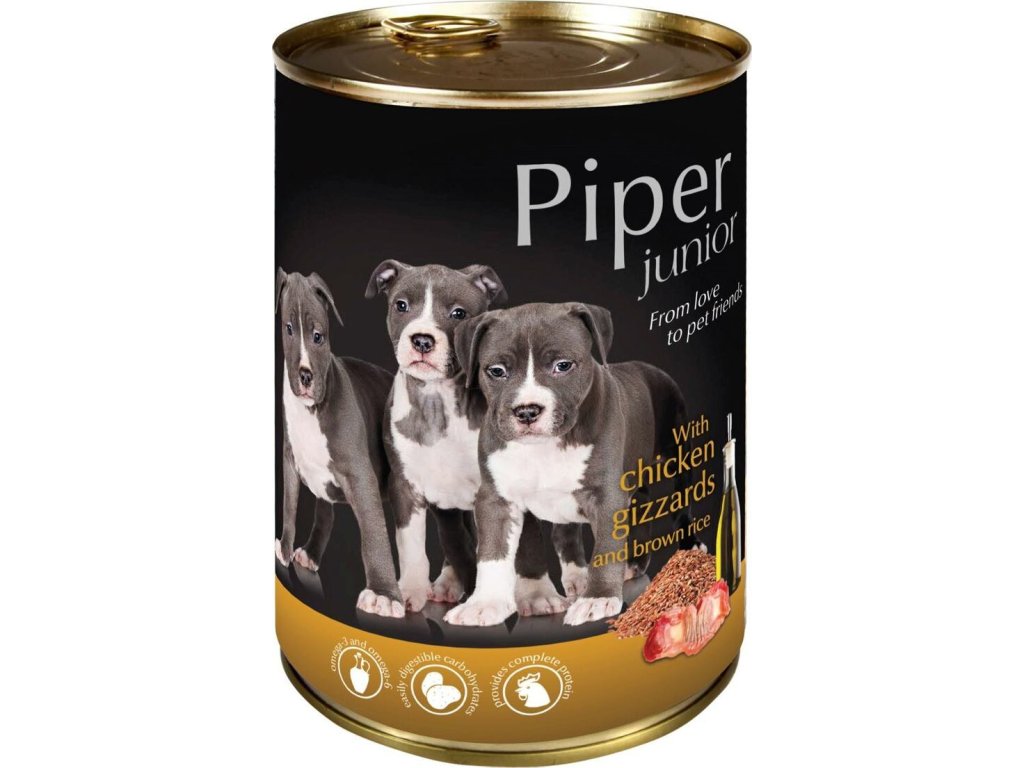 PIPER JUNIOR s kuřecími žaludky a hnědou rýží, konzerva pro štěňata 400g