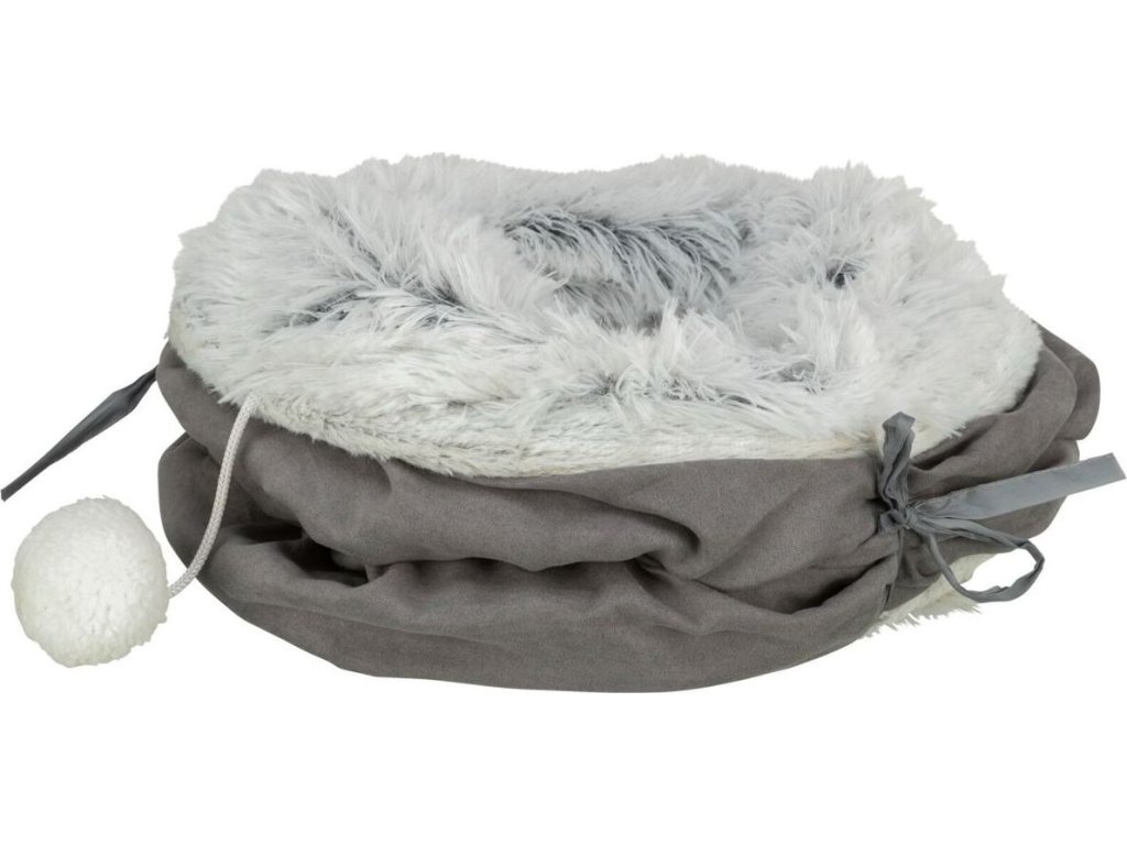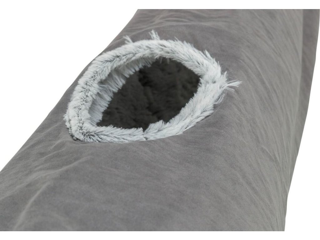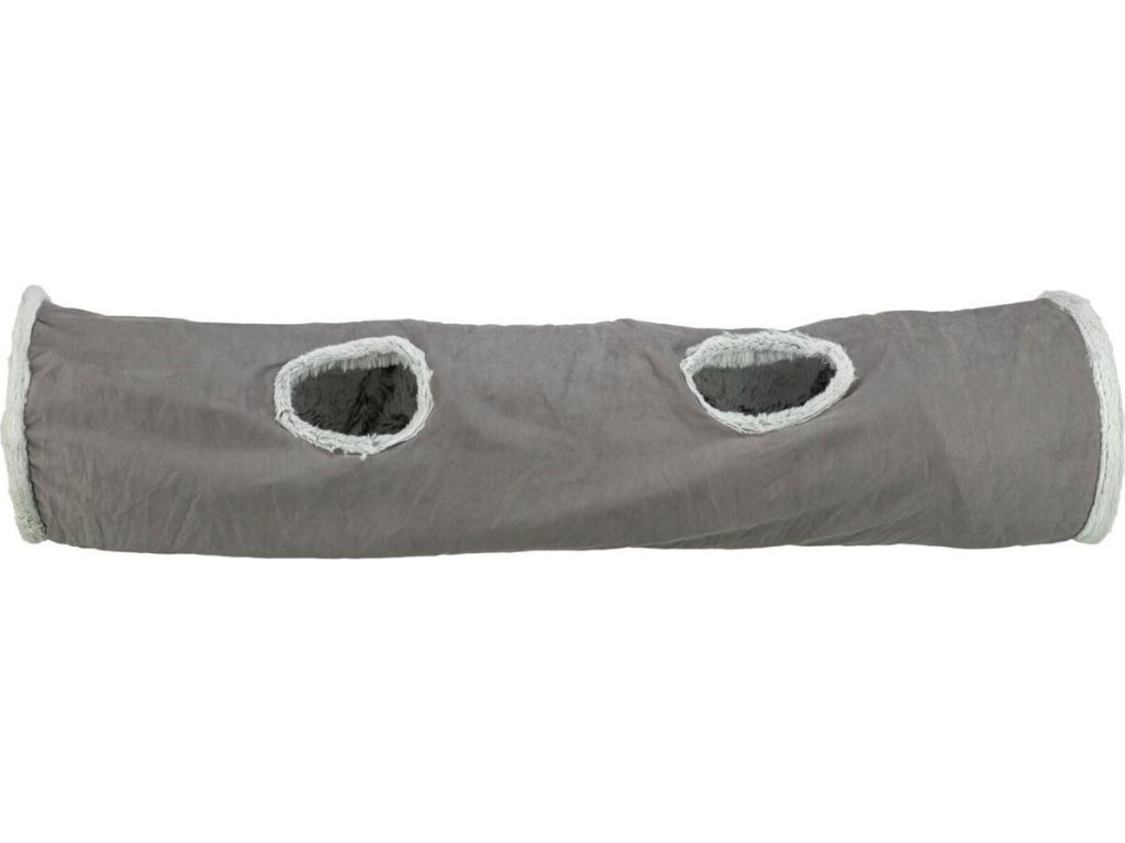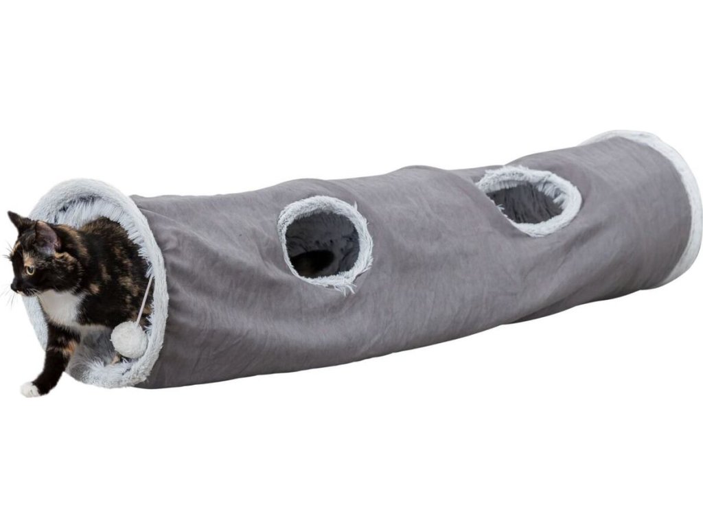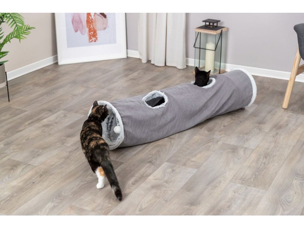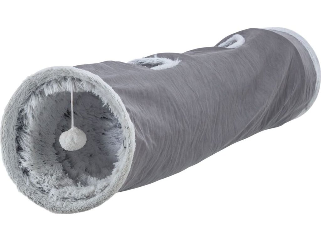Plyšový tunel pro kočky HARVEY s hračkami, 4 vstupy, 27 x 116 cm, šedá