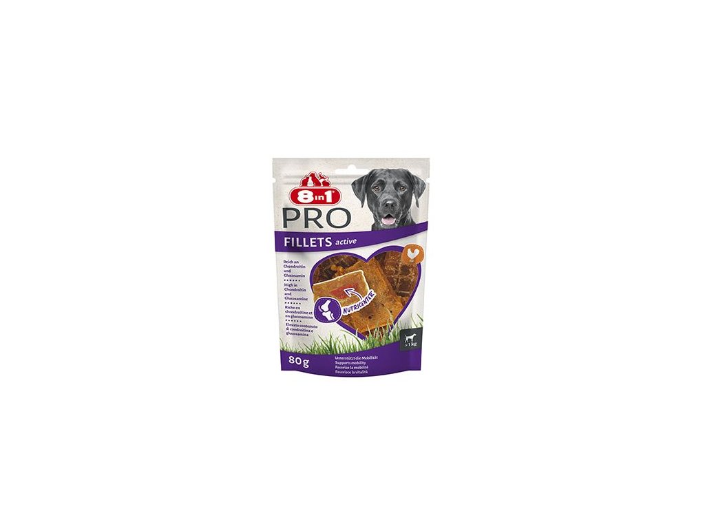 Pochoutky 8in1 Fillets Pro Active jsou prvotřídní lahodné dobroty pro podporu vitality vašeho psa. Pochoutky 8in1 Fillets Pro jsou nejen chutné a s nízkým obsahem tuku, ale také vašemu psovi nabídnou lahodnou pochoutku s malým překvapením. Tyto dobroty jsou plné lahodného kuřecího masa se speciálním výživným jádrem, které obsahuje zdravé a funkčními přidané složky přispívající k pohodě a vitalitě vašeho psa. Jedinečné výživné jádro je obohaceno o chondroitin a glukosamin, které napomáhají k udržení zdravých kostí a kloubů. Pochoutky 8in1 Fillets Pro Active obsahují pouze 4,5 % tuku a jsou zdravou odměnou mezi krmením. Díky uzavíratelnému sáčku jsou tyto pochoutky ideální pro procházky venku nebo při cestování.