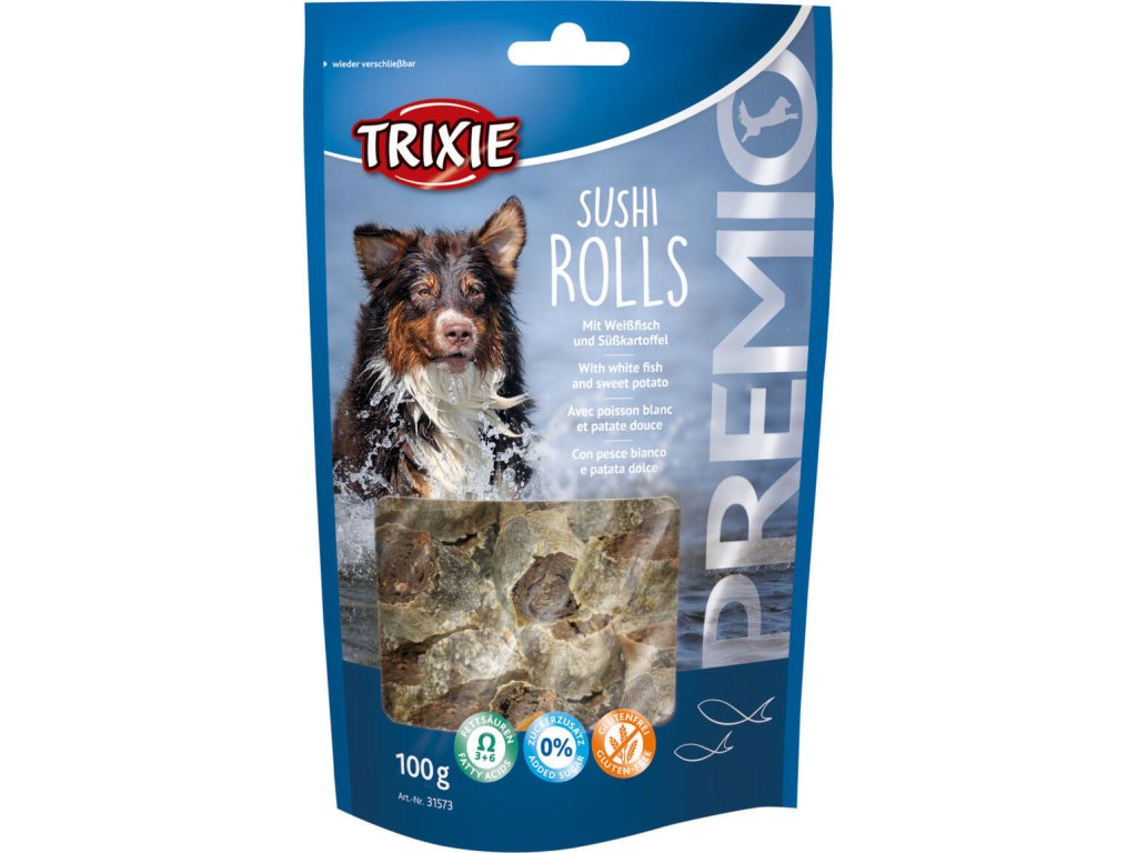 Premio SUSHI BITES Light - 100% rybí kolečka je skvělá psí pochoutka ze 100% rybího masa (bílá ryba)- produkt obsahuje Omega-3 a Omega-6 mastné kyseliny