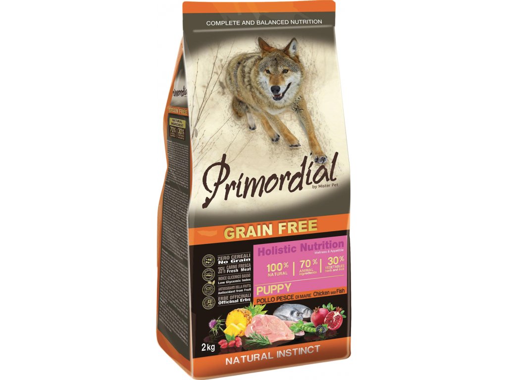 Primordial Grain-Free Puppy Chicken and Sea Fish je kompletní bezobilné krmivo bohaté na proteiny vysoké biologické hodnoty a obsahuje vhodnou kompozici aminokyselin. Kuřecí maso, striktně z volného výběhu, poskytuje jednoduše stravitelné bílkoviny a atraktivní chuť, kterou psi milují. Mořské ryby bohaté na minerální soli poskytují snadno stravitelné bílkoviny a, jako všechny ryby, jsou bohaté na omega 3 mastné kyseliny, které vykonávají důležitou kosmetickou funkci pro kůži a srst a jsou velmi prospěšné pro kardiovaskulární systém (srdce a cévy). Ovoce a zelenina bohaté na vitaminy, minerály a fytonutrienty, trávicí vlastnosti ananasu, antioxidační funkce granátového jablka a šípku a podpora jater ze strany ostropestřce dodávají tomuto krmivu dokonalou rovnováhu chuti a živin. Jedná se o skutečně holistický produkt, který aktivně přispívá k celkovému zdraví psa.