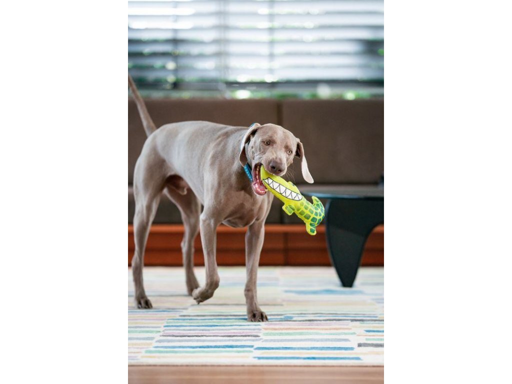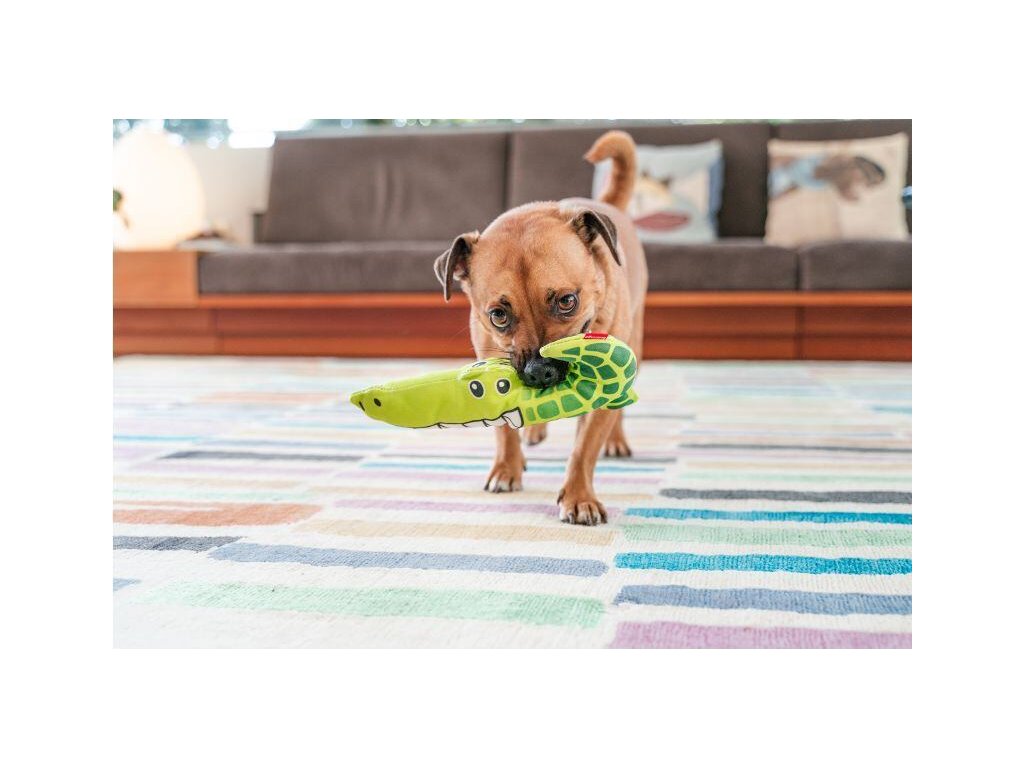 Tenhle vysmátý krokodýl je spolehlivým komplicem pro každou rošťárnu. Je příjemně měkký, lehký, a přitom odolný. Kyle píská a zvládne i divočejší hru doma nebo venku. Materiál je i přes jeho vlastnosti jemný a šetrný k psím zubům. S touto hračkou si tak můžete bez obav hrát i se psími seniory a štěňátky. Výdrž tkaniny proti prokousnutí a roztržení vás překvapí a neodolatelný veselý design jistě pobaví. Hračky DURABLES jsou vhodné pro všechna plemena. Velikostně vyhovují i větším psům, ale díky své nízké hmotnosti si s nimi poradí i menší chlupáči. Red Dingo věnovalo dva roky vývoje těmto odolným látkovým hračkám, které svou pevností slibují předčit všechny ostatní látkové hračky na trhu! Je třeba pamatovat na to, že žádná hračka pro psy, která je určená pro bezpečnou hru, není nezničitelná, a i když jsou Red Dingo DURABLES odolnější než běžné látkové hračky, jsou určeny pro hru pod dozorem. Kyle a jeho parta australských kamarádů jsou tu zkrátka od toho, aby vydrželi i divočejší hru a zároveň bylo dovádění s nimi příjemné a bezpečné. Velikost: 27,5 x 12,5 x 3,5 cm Hmotnost: 95 g Látka: super silný, netoxický, syntetický materiál Potisk: netoxická barviva (ověřeno SGS – přední světová inspekční a testovací společnost) Výplň: polyester Pískátko: polypropylen Hračky perte v ruce nebo v pračce na nejšetrnější stupeň a nízkou teplotu. Nesušte v sušičce.