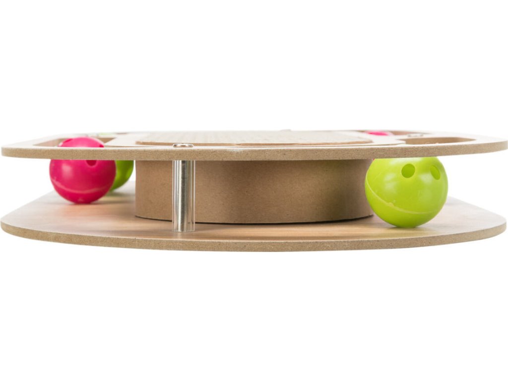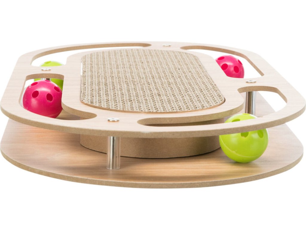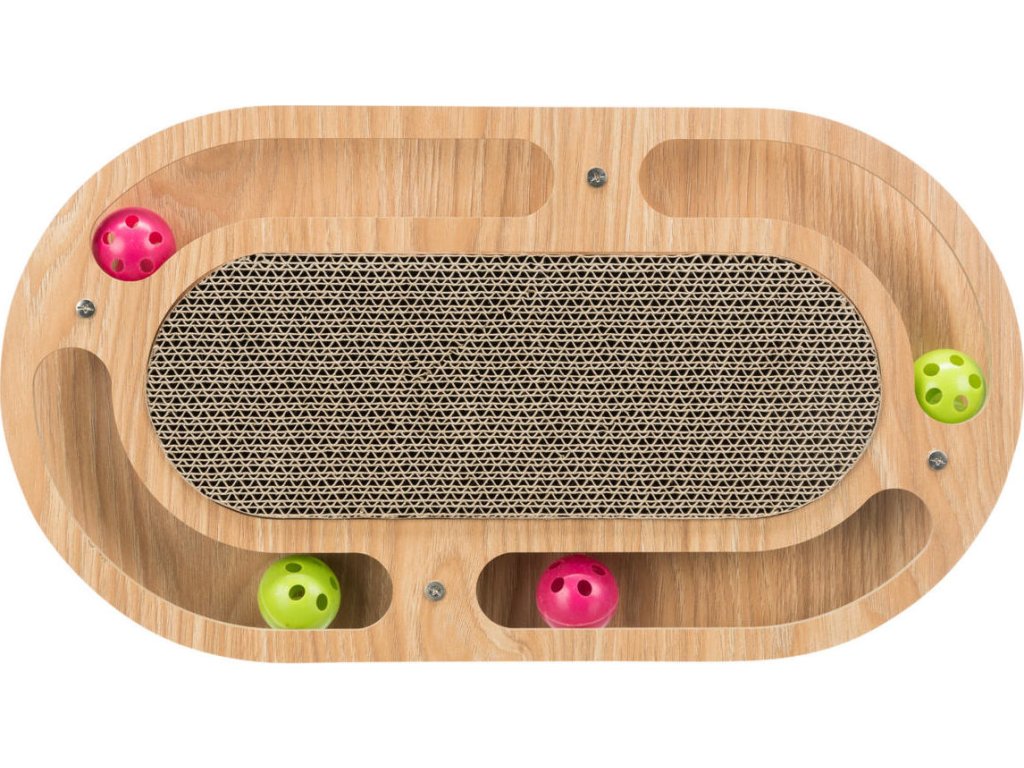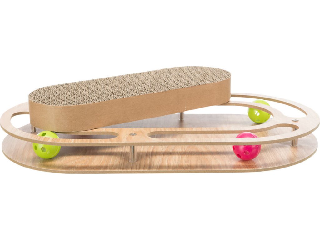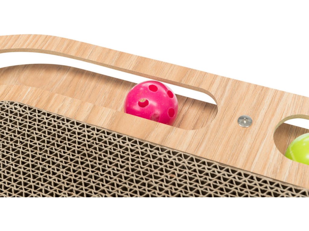 Škrábací karton v dřevěném rámu, s catnipem a hračkami, 45x4x25cm