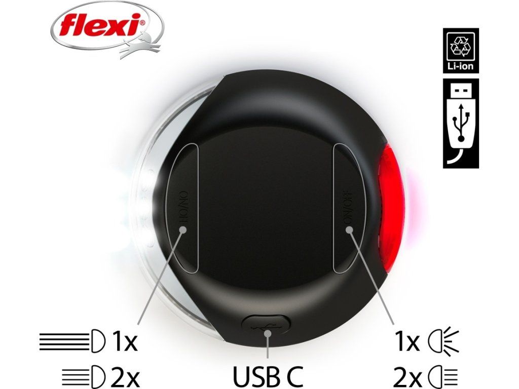 Doplněk pro vodítka flexi New Classic, New Comfort velikosti S, M a L. Ultra jasné přední LED světlo a červené zadní světlo mohou být ovládána každé zvlášť. Systém může být připevněn (pomocí suchého zipu) na obě dvě strany vodítka, záleží, zda jste pravák či levák. Nabíjí se přes USB kabel.