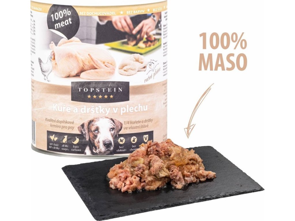 Výtečná konzerva plná celou čtvrtkou kuřete a hovězími dršťkami pro dokonalou svačinku přináší pestrost do jídelníčku vašeho mazlíčka. Maso je přirozenou potravou každého masožravce, které zajišťuje potřebný přísun bílkovin se všemi esenciálními aminokyselinami. Pomáhá zlepšit příjem suchého krmiva, doplnit tekutiny a je vhodná při citlivém zažívání i potravních alergiích. Konzervy vynikají nejen svými nutričními a dietními hodnotami, ale také obsahují vysoký podíl vitamínů a minerálů. Ručně plněné konzervy v potravinářské kvalitě jsou pečlivě zpracované a přináší nejvyšší kvalitu vstupních surovin. Konzerva je opatřena plastovým víčkem, které uchovává maso v konzervě čerstvé a zároveň zabraňuje zápachu v lednici, vydrží v chladu minimálně 3 dny. Kuřecí kosti v konzervě nejsou nebezpečné, díky sterilizaci při vysokém tlaku a teplotě jsou zcela měkké a lze je rozmáčknout mezi prsty. Konzerva je čistě přírodním produktem té nevyšší kvality!