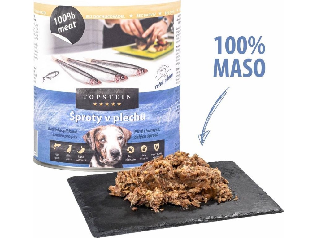 Šprot - Šproty jsou velmi bohaté na živočišné bílkoviny, které jsou nezbytné pro tvorbu a opravu svalové hmoty a kostí a k tvorbě potřebných hormonů a enzymů. Dále jsou často bohaté na omega-3 mastné kyseliny, které mohou pomoci udržet zdraví srsti a kůže psa. Tyto mastné kyseliny také podporují zdraví kloubů a snižují zánětlivé procesy v těle. Ryby obsahují také mnoho důležitých vitamínů a minerálů, jako je vitamín D, vitamín B12 a selen.