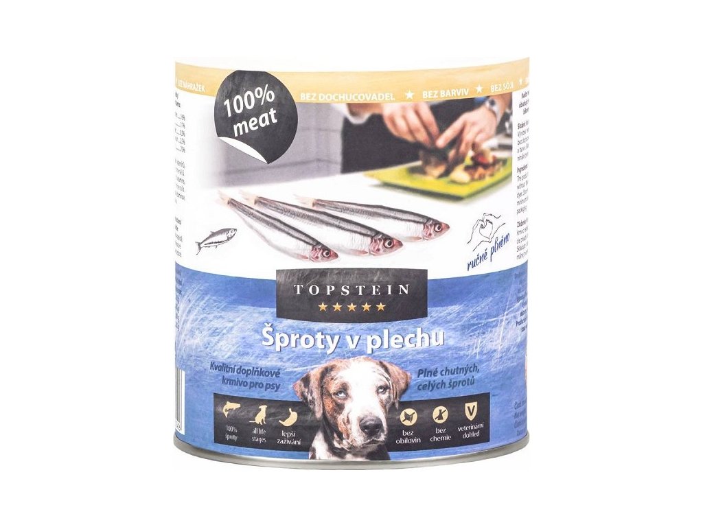 Výtečná konzerva plná celých šprotů pro dokonalou svačinku přináší pestrost do jídelníčku vašeho mazlíčka. Maso je přirozenou potravou každého masožravce, které zajišťuje potřebný přísun bílkovin se všemi esenciálními aminokyselinami. Pomáhá zlepšit příjem suchého krmiva, doplnit tekutiny a je vhodná při citlivém zažívání i potravních alergiích. Konzervy vynikají nejen svými nutričními a dietními hodnotami, ale také obsahují vysoký podíl vitamínů a minerálů. Ručně plněné konzervy v potravinářské kvalitě jsou pečlivě zpracované a přináší nejvyšší kvalitu vstupních surovin. Konzerva je opatřena plastovým víčkem, které uchovává maso v konzervě čerstvé a zároveň zabraňuje zápachu v lednici, vydrží v chladu minimálně 3 dny. Kuřecí kosti v konzervě nejsou nebezpečné, díky sterilizaci při vysokém tlaku a teplotě jsou zcela měkké a lze je rozmáčknout mezi prsty. Konzerva je čistě přírodním produktem té nevyšší kvality!