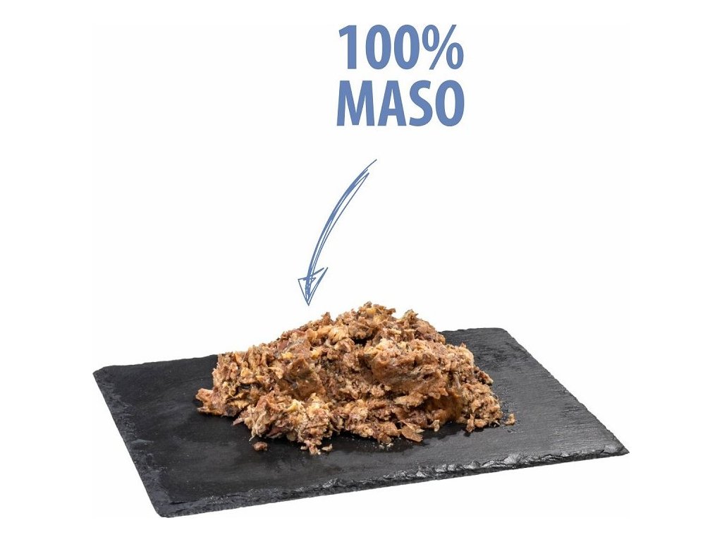100% maso - Pes nebo kočka je především masožravec. Krmivo se 100% masem je jejich přirozená potrava a tak zaručuje nejvyšší kvalitu a biologickou hodnotu proteinů. To podporuje tvorbu svalů, dobrou kondici a vitalitu.