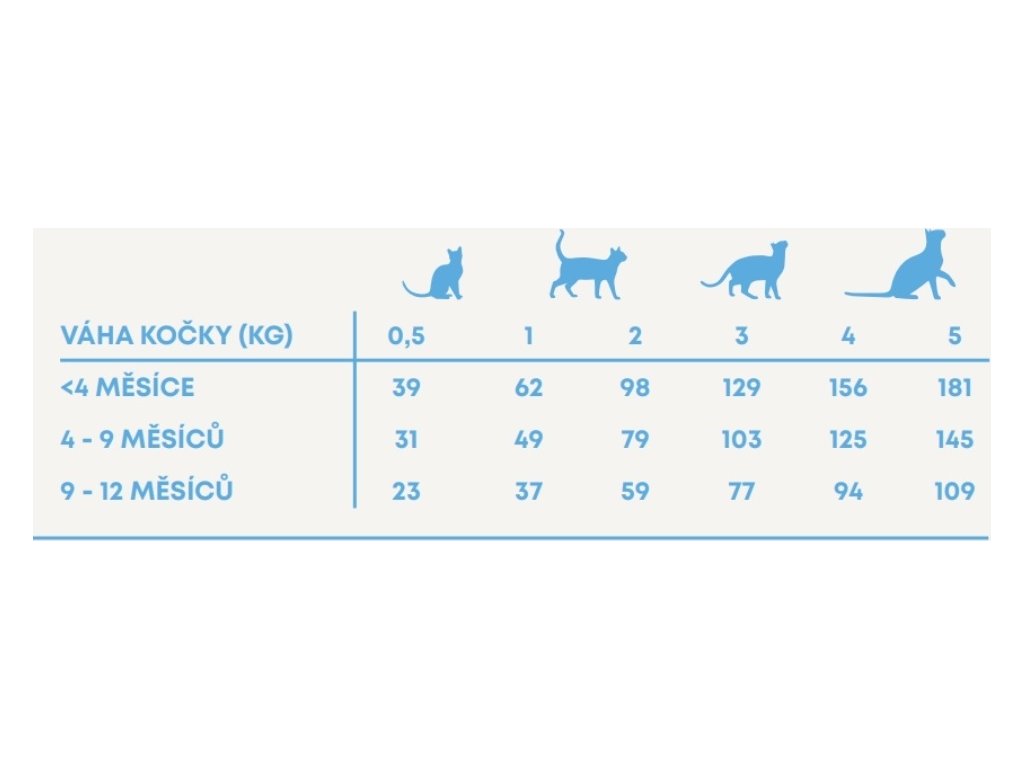 Krmný návod: Změnu krmiva je třeba provádět postupně po dobu 7 dní. Po odstavení krmte 4 x až 5 x za den. Do 4 měsíců věku smícháním s teplou vodou v poměru 1 díl vody a 3 díly krmiva. Odstraňte zbytky krmiva. Kotěti okolo 1 roku postupně snižujte počet krmných dávek až na 2 za den. Kočka musí mít vždy přístup k čisté, čerstvé vodě. Skladování: skladujte na chladném a suchém místě. Obal by měl být po použití vždy bezpečně uzavřen.
