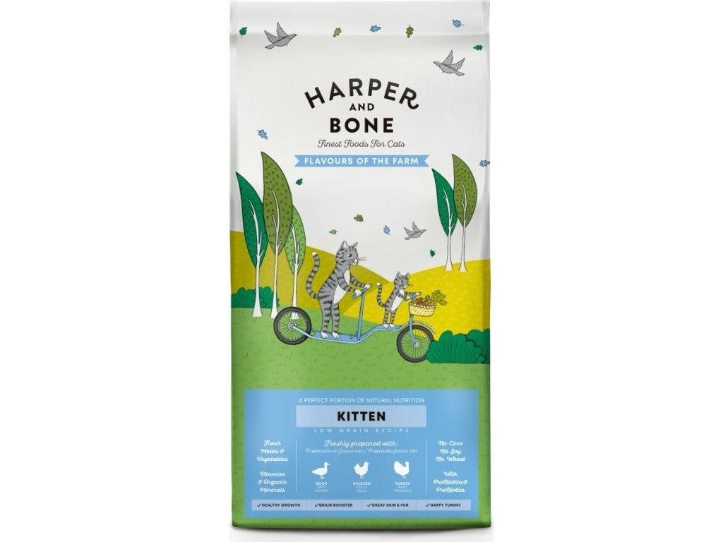 Harper and Bone Cat Kitten příchutě farmy složené pouze z nejkvalitnějších surovin s vysokým podílem masa, přídavkem superpotravin a čerstvé zeleniny, zaručující prospěšné živiny a přirozenou chuť pro dokonale vyváženou výživu.