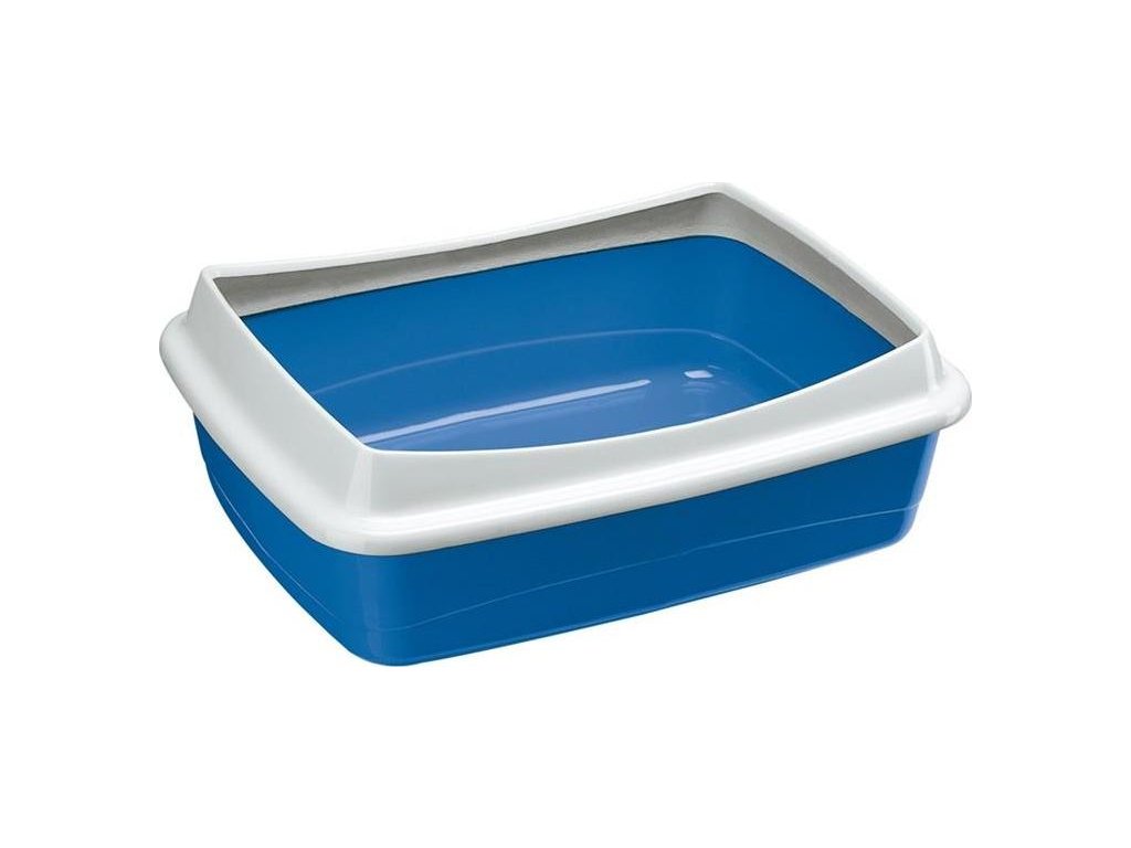 Plastová otevřená toaleta pro kočky se zvýšeným okrajem.