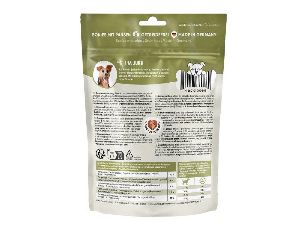 Poloměkké kostičky pro psy. Ideální při výcviku nebo jako chutná malá odměna. Yummeez neobsahují obiloviny, takže jsou vhodné i pro alergické psy. Kromě vysokého podílu masa obsahují také brambory, tapiocu (maniok jedlý) a zdravou vojtěšku. Sáček lze znovu uzavřít a pamlsky tak vydrží déle čerstvé. Složení: maso a živočišné vedlejší produkty (dršťky 6 %), rostlinné vedlejší produkty (brambory 12 %,tapioca 6 %,vojtěška 4 %) Analýza: hrubé bílkoviny 30 %, hrubé oleje a tuky 5 %, hrubá vláknina 3,5 %, hrubé popeloviny 5 %, vlhkost 27 % Doplňkové látky: konzervační látky Yummeez jsou vyrobené v Německu. Podávejte jako odměnu. Zajistěte dostatek pitné vody. Určeno pro psy.