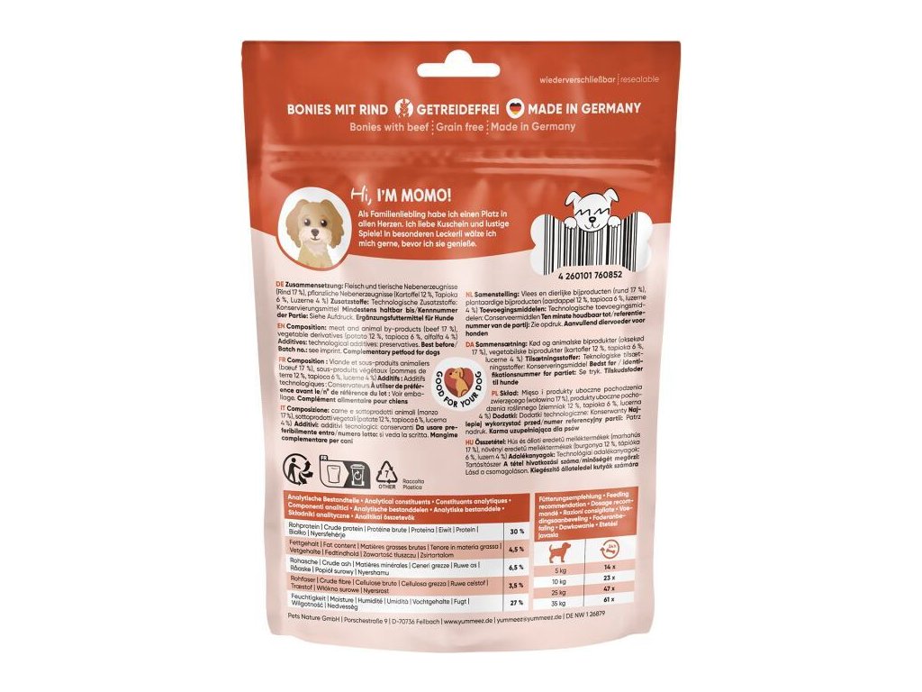 Poloměkké kostičky pro psy. Ideální při výcviku nebo jako chutná malá odměna. Yummeez neobsahují obiloviny, takže jsou vhodné i pro alergické psy. Kromě vysokého podílu masa obsahují také brambory, tapiocu (maniok jedlý) a vojtěšku. Sáček lze znovu uzavřít a pamlsky tak vydrží déle čerstvé. Složení: maso a živočišné vedlejší produkty (17% hovězí), rostlinné vedlejší produkty (12% brambory, 6% tapioca, 4% vojtěška) Analýza: hrubé bílkoviny 30 %, hrubé oleje a tuky 4,5 %, hrubá vláknina 6,5 %, hrubé popeloviny 3,5 %, vlhkost 27 % Doplňkové látky: konzervační látky Yummeez jsou vyrobené v Německu. Podávejte jako odměnu. Zajistěte dostatek pitné vody. Určeno pro psy.
