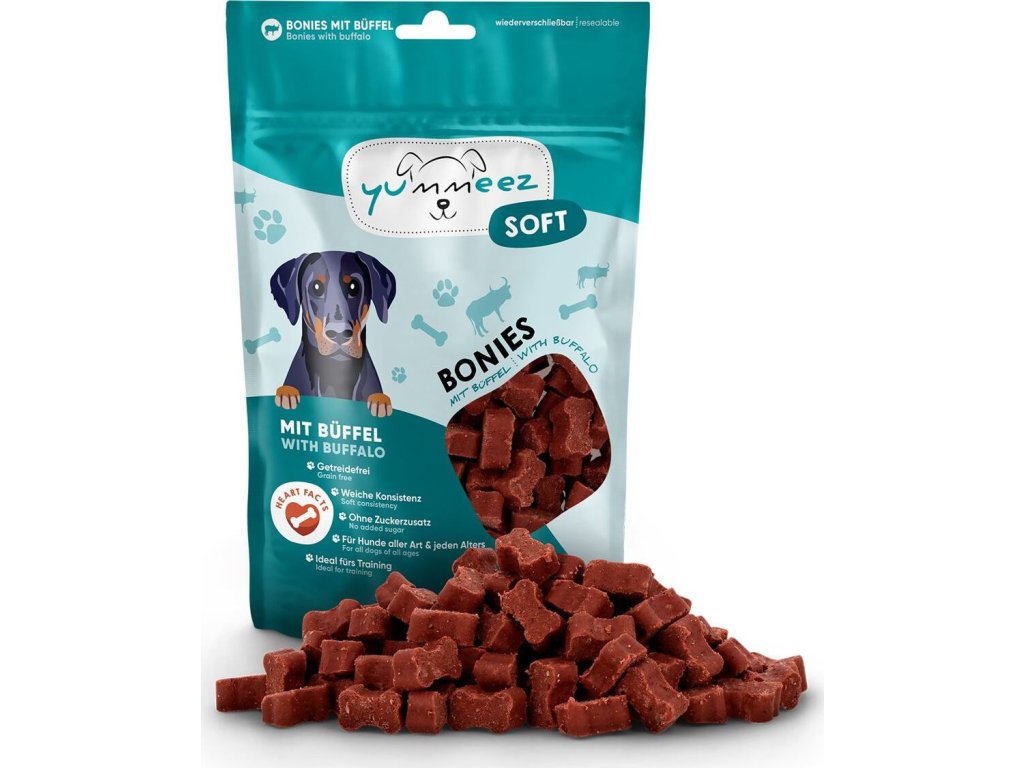 Měkké pamlsky ve tvaru drobných kostiček s netradiční chutí buvolího masa jsou skvělé nejen na trénink – snadno je rozdělíte v ruce, krásně voní a neobsahují obiloviny, umělé konzervanty, dochucovadla, ani přidaný cukr. Hodí se pro psy každého věku a velikosti a neobvyklá chuť buvola může zachutnat i mazlíčkům, kteří tradiční druhy masa odmítají. Soft Bonies jsou baleny ve znovu uzavíratelných pytlíčkách, díky kterým zůstanou déle čerstvé. neobvyklý druh masa – sušené buvolí maso měkké, snadno porcovatelné – ideální pro výcvik bez obilovin, lepku, dochucovadel a přidaného cukru vhodné pro psy každého věku a velikosti ve znovu uzavíratelném balení – pamlsky zůstanou déle čerstvé a voňavé Složení: maso a vedlejší výrobky živočišného původu (drůbež, 3,3 % sušený buvol), brambory, vedlejší výrobky rostlinného původu, minerální látky Analýza: hrubé bílkoviny 26 %, hrubé oleje a tuky 4,6 %, hrubá vláknina 1,2 %, hrubé popeloviny 6,3 %, vlhkost 21 %