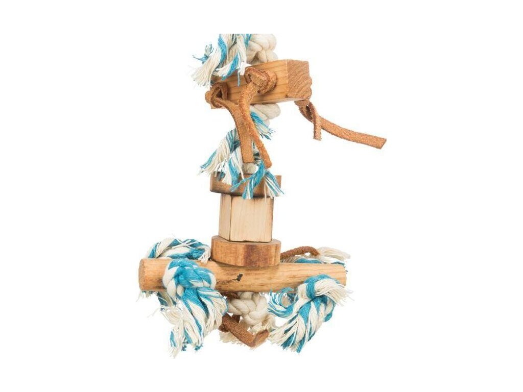 Závěsná dřevěná hračka špalíky s uzlíky a koženými šňůrkami